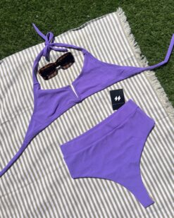 Bikini texturada tiro alto y corpiño con tiras de ajuste